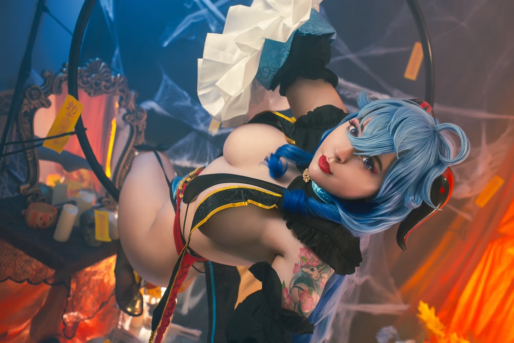 Here is Jiangshi Ganyu surrounded by smoke and Halloween decorations. ๐